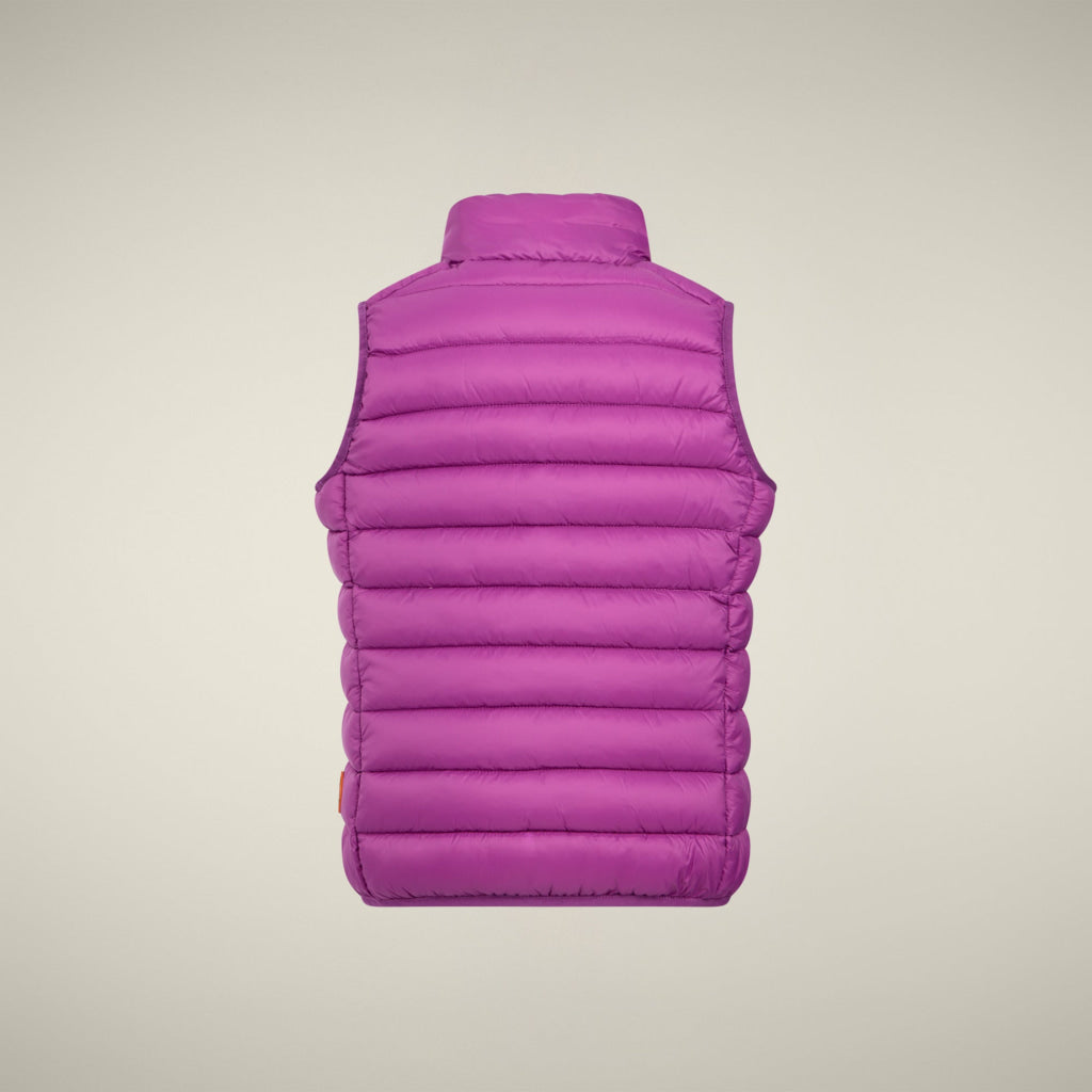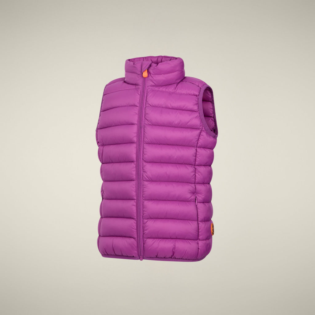代表作である「ANDY」モデルのキッズ パファーベストは、ママとパパの物と同じデザインです。高い襟、フロントジップ開閉、ジップ付きポケットが特徴です。動物由来成分不使用のソフトなPLUMTECH®パッド、オリジナルジッププル、オレンジの丸型ロゴが、SAVE THE DUCKの独自のデザインを際立たせています。