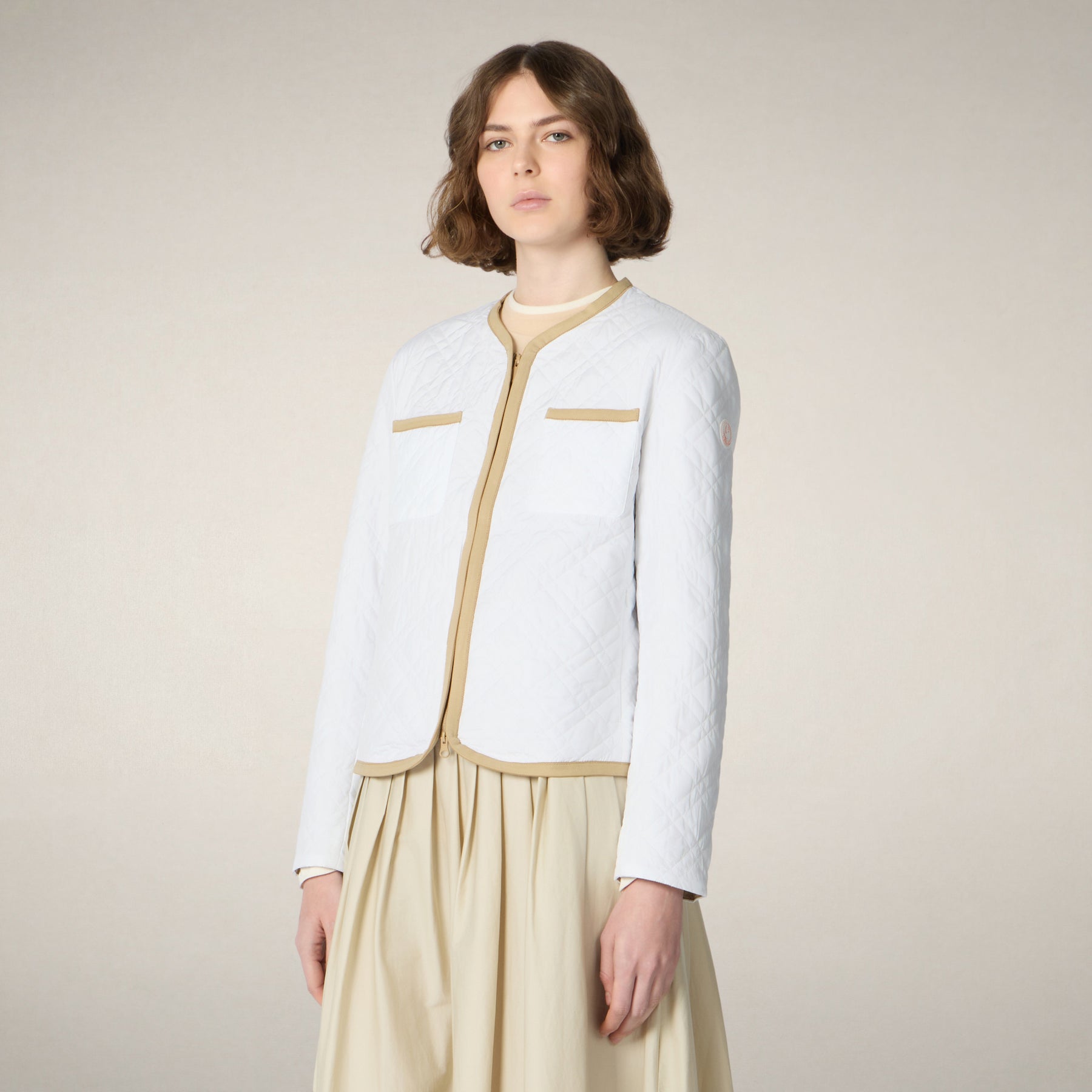ウィメンズの「JALINA」モデル、パファージャケットは、襟なし、フードなしのレイヤードスタイルで、ダイヤモンドキルティングが洗練された質感を演出します。コントラストの効いたベージュのバンドで縁取られた中央のジッパーは、2つの胸ポケットと両サイドのジッパーポケットと繋がっており、収納力とシルエットのバランスが取れています。お揃いのバッグに収納でき、アームには同系色の丸いロゴが施されています。