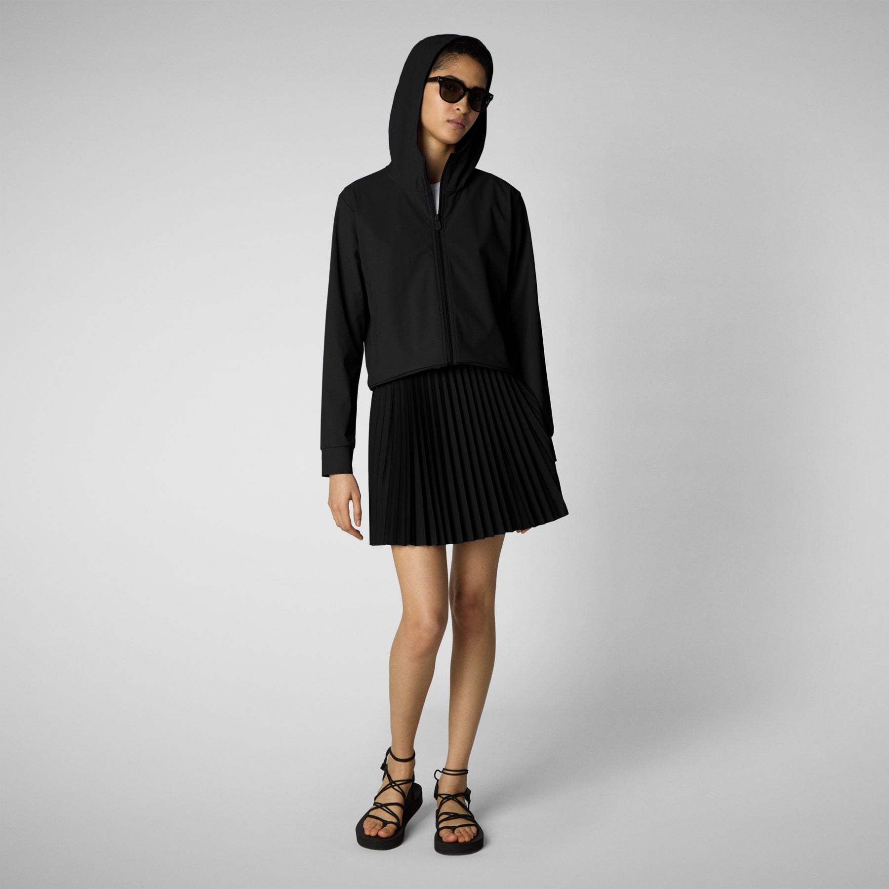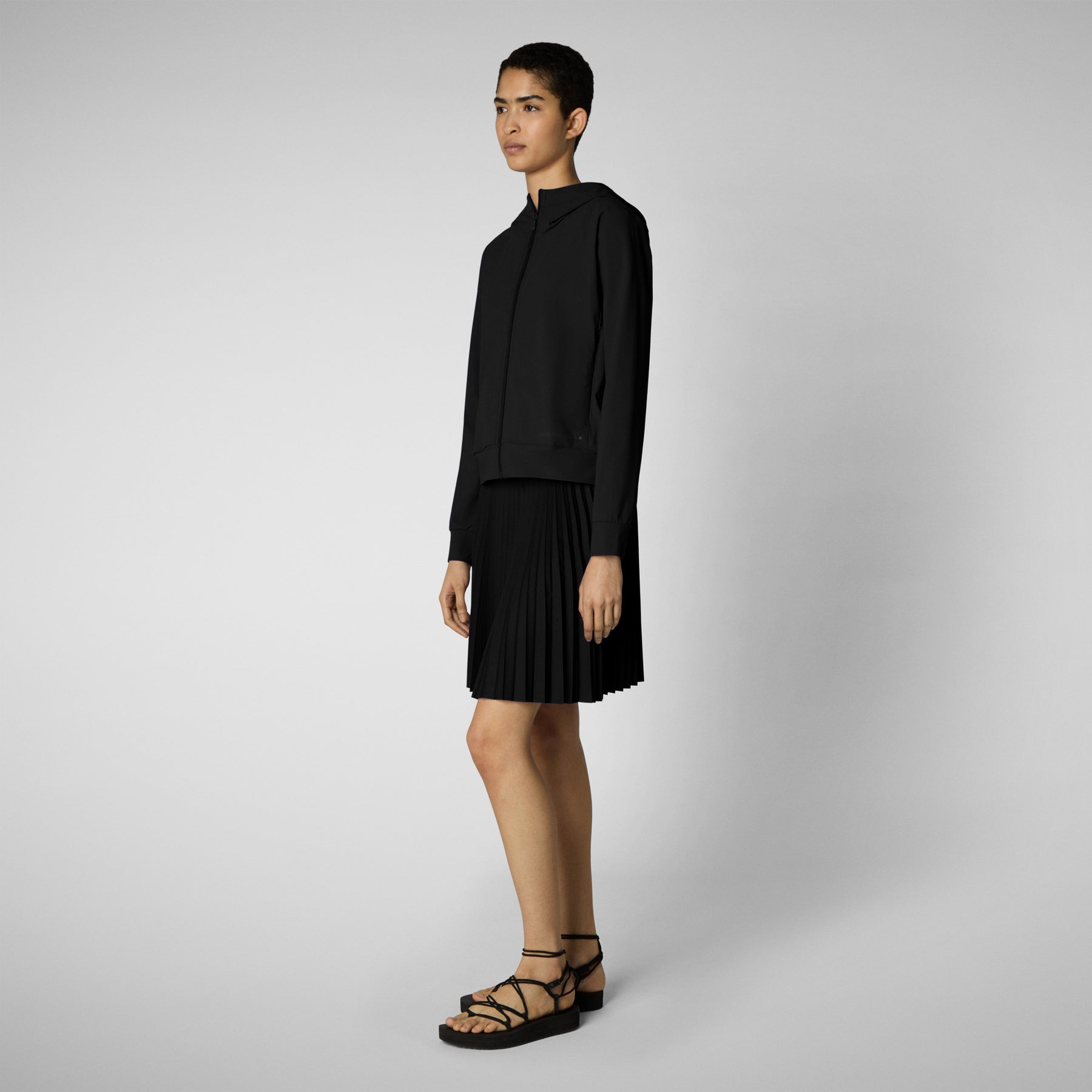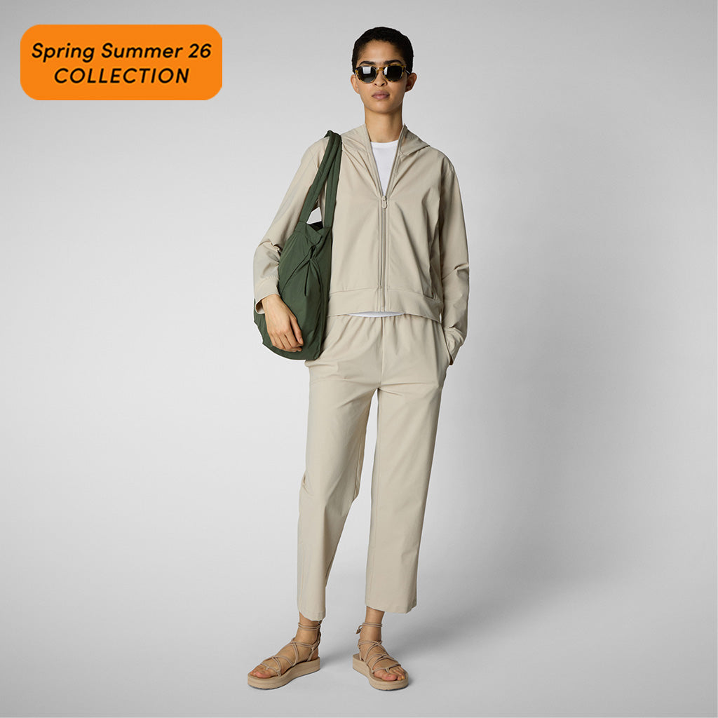 旅程に合わせて作られた、フード付きレディース「FYI」モデル トラックジャケットは、定番のジャケットをシンプルにまとめ上げ、軽やかな着心地、4方向ストレッチ、そして軽量で実用的なデザインを実現。中央のナイロンジッパー、ジッパー付きサイドポケット、そしてゆったりとしたフードで、外出先でも重ね着しやすいデザインです。パンツと合わせれば、一日中活躍するユニフォームとして活躍します。裾にはSAVE THE DUCKのロゴ、背面にはオレンジ色のダックロゴがエンボス加工されています。