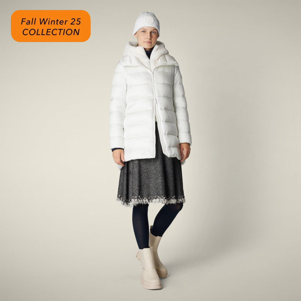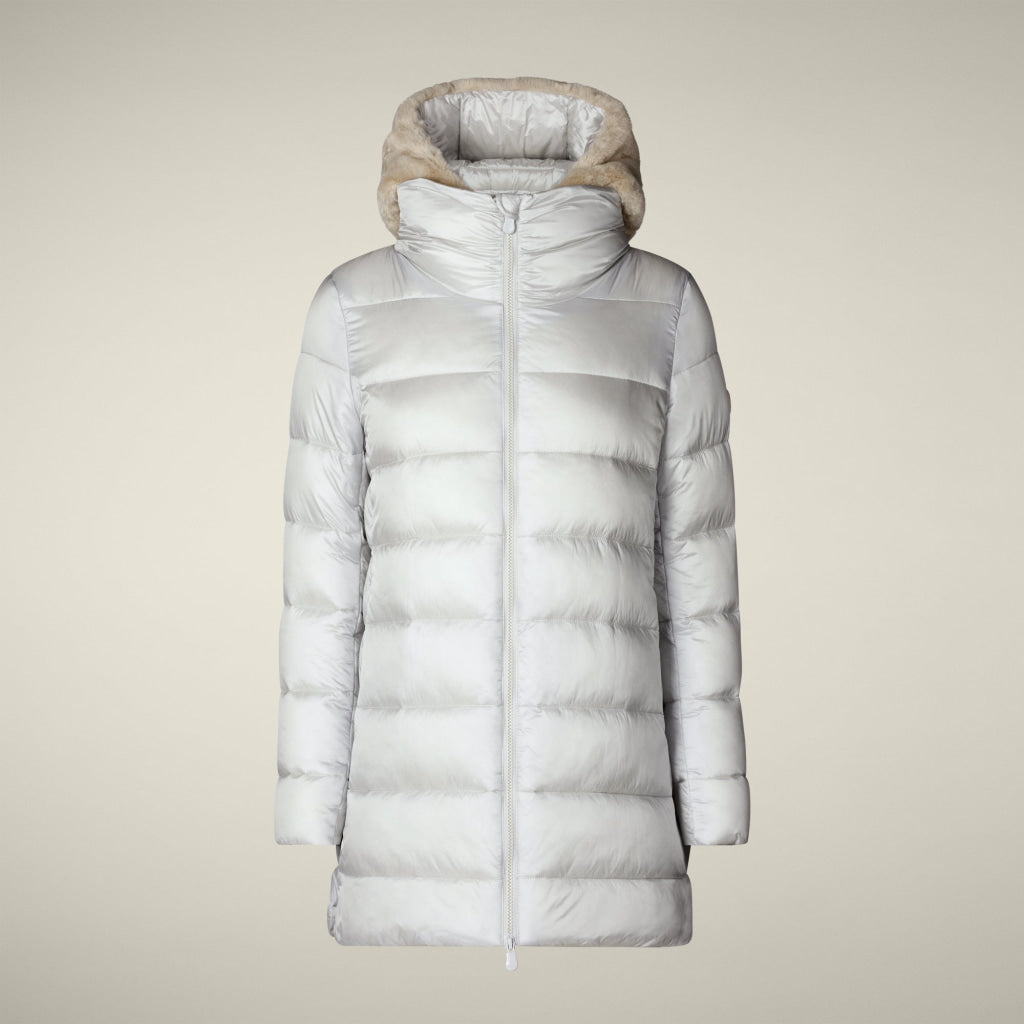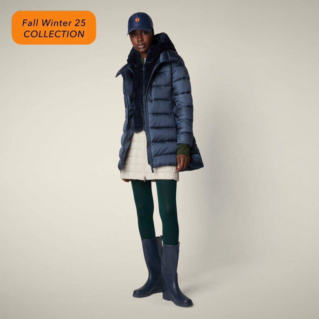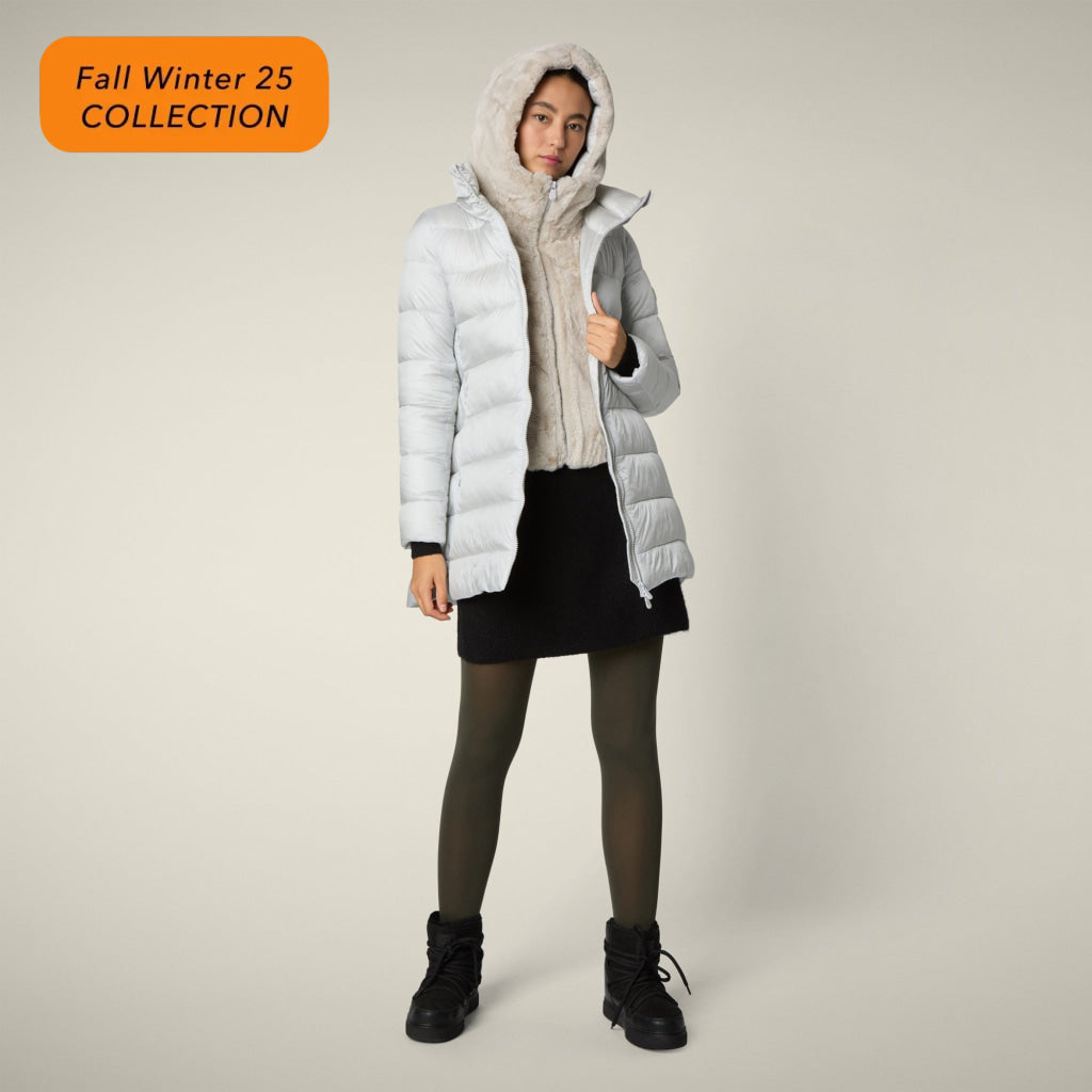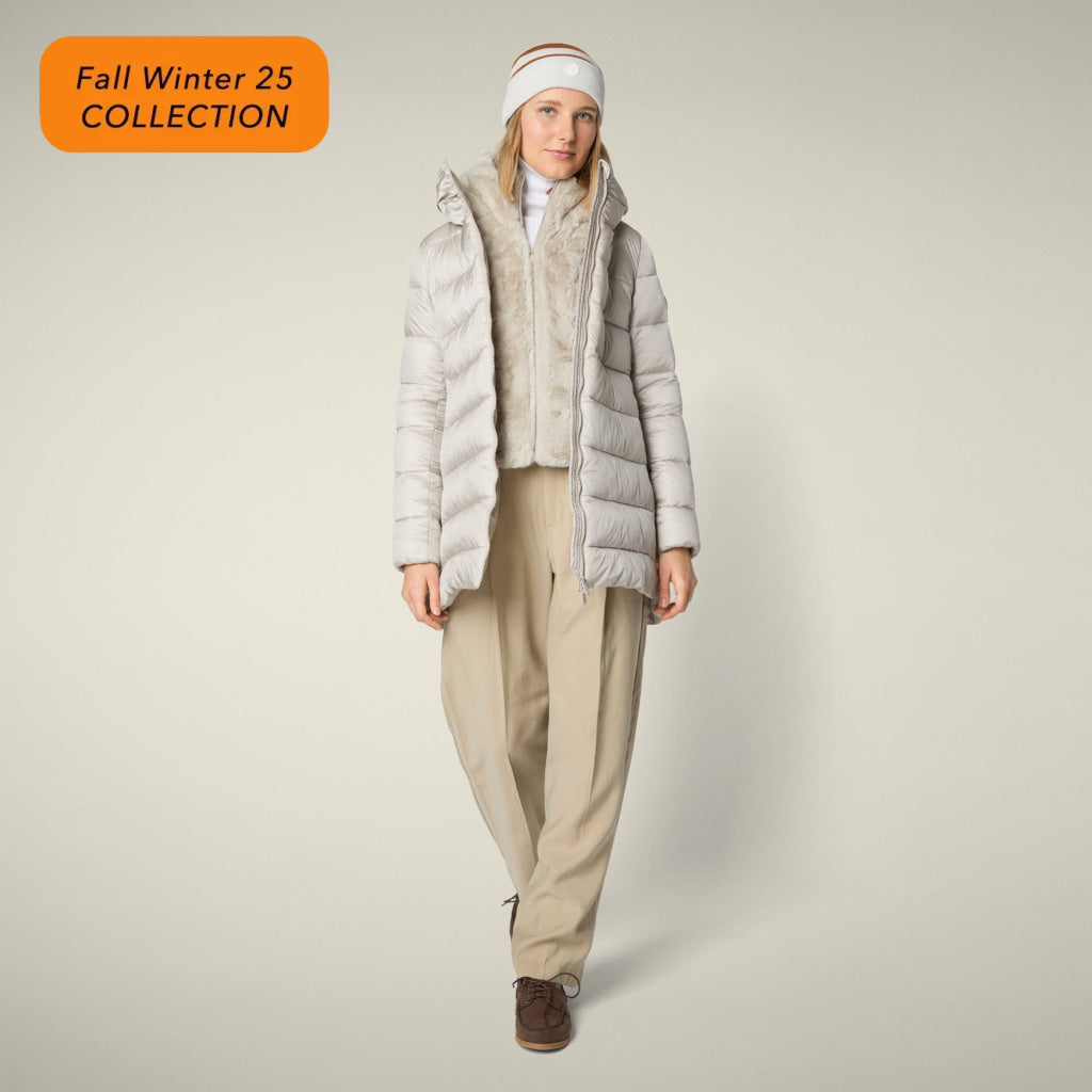 光沢のあるリサイクル・ナイロン製のAライン・ミドル丈パファー「MATILDA」は、同系色の取り外し可能なフェイクファーをフロントパネルとフードにあしらい、洗練されたタッチに。RECYCLED PLUMTECH®のパッド入りで保温性も抜群。シグネチャーの引手を備えた2WAYジッパー、隠しジッパー式ポケット、袖の同系色のロゴが特徴です。