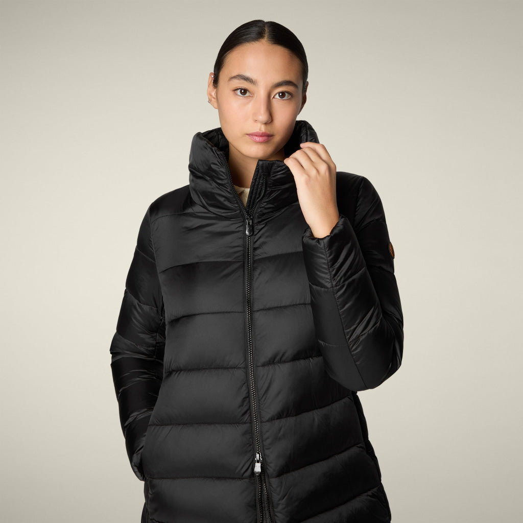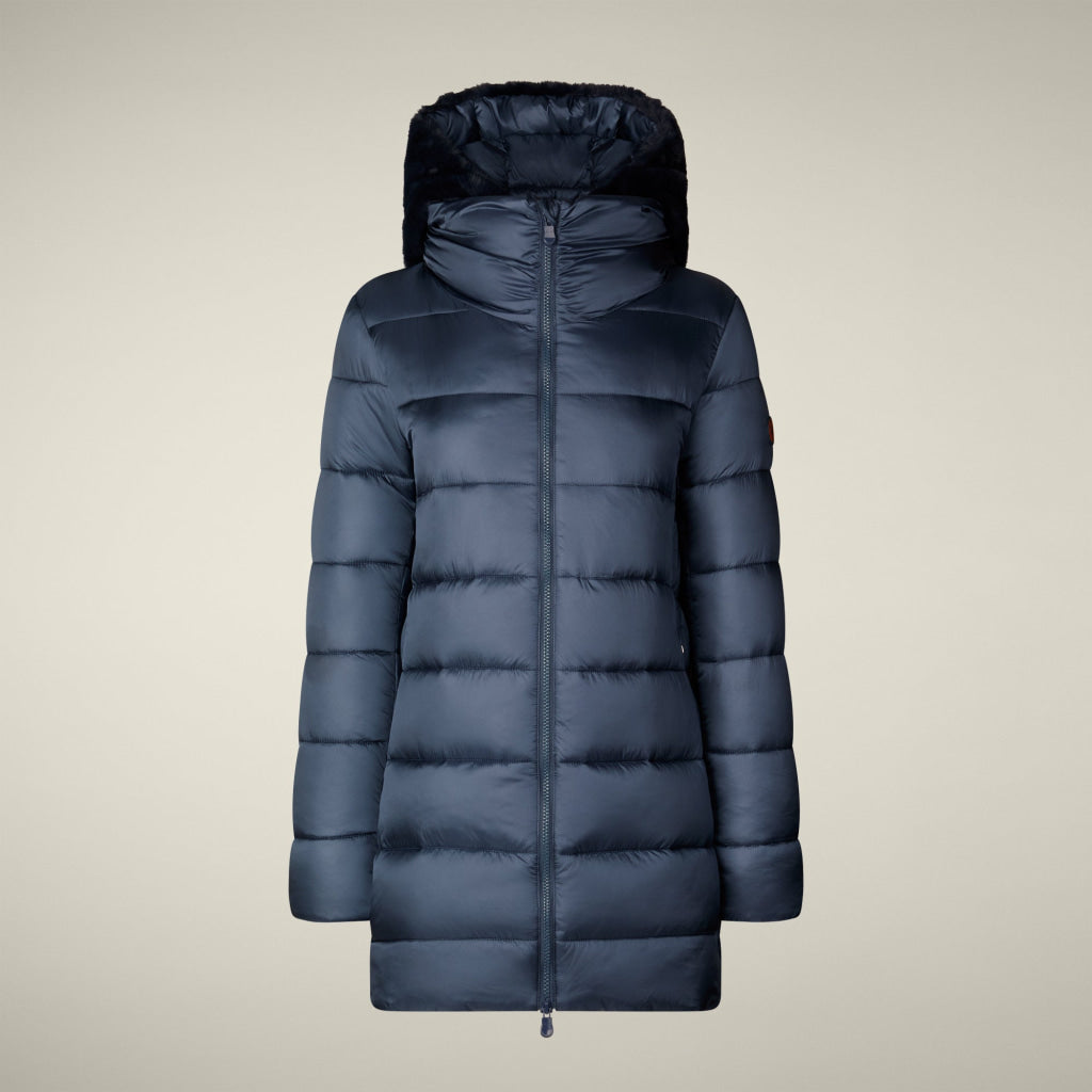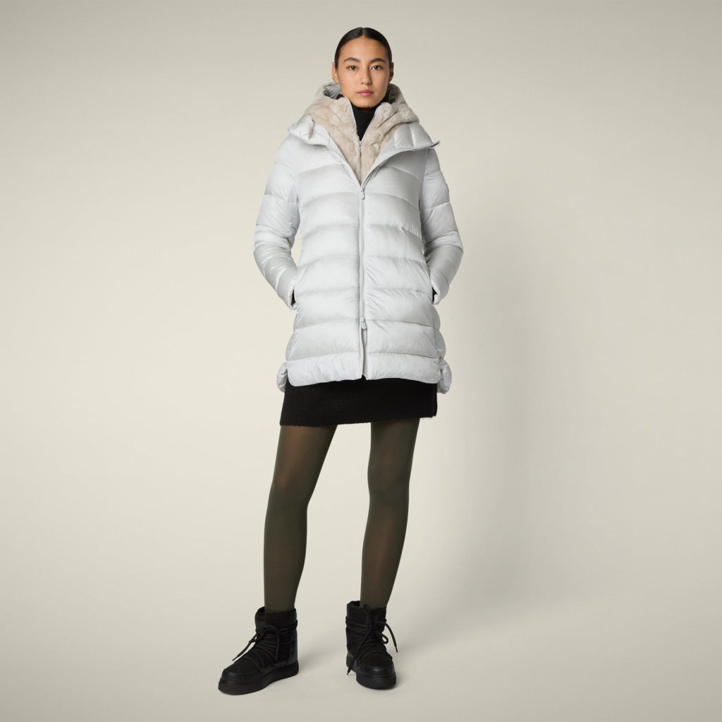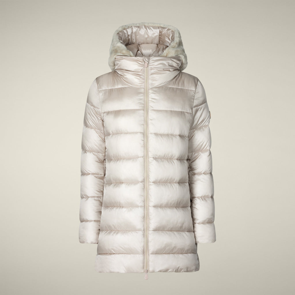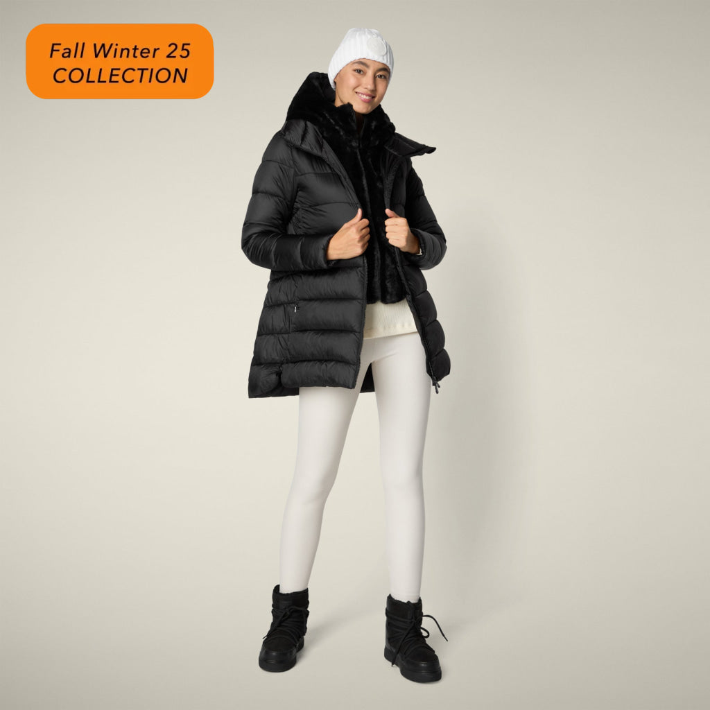 光沢のあるリサイクル・ナイロン製のAライン・ミドル丈パファー「MATILDA」は、同系色の取り外し可能なフェイクファーをフロントパネルとフードにあしらい、洗練されたタッチに。RECYCLED PLUMTECH®のパッド入りで保温性も抜群。シグネチャーの引手を備えた2WAYジッパー、隠しジッパー式ポケット、袖の同系色のロゴが特徴です。