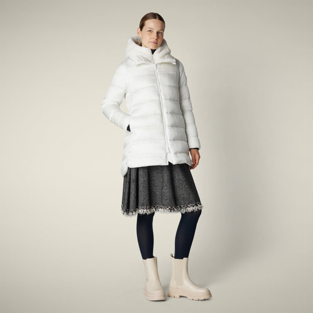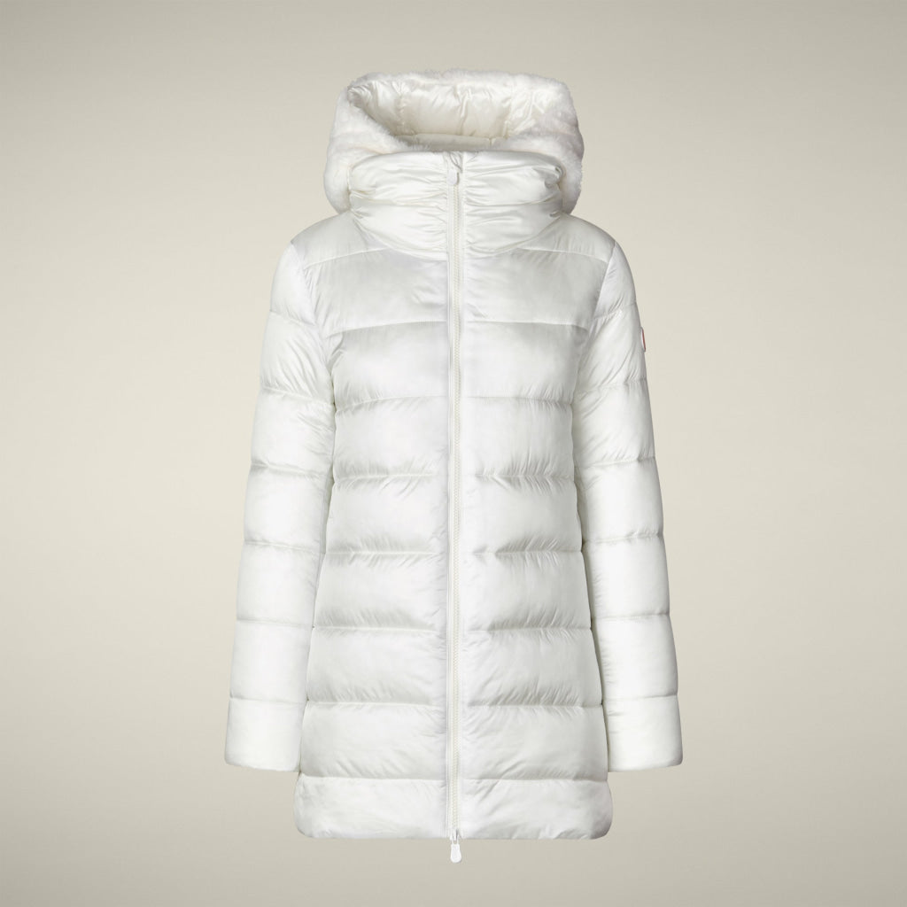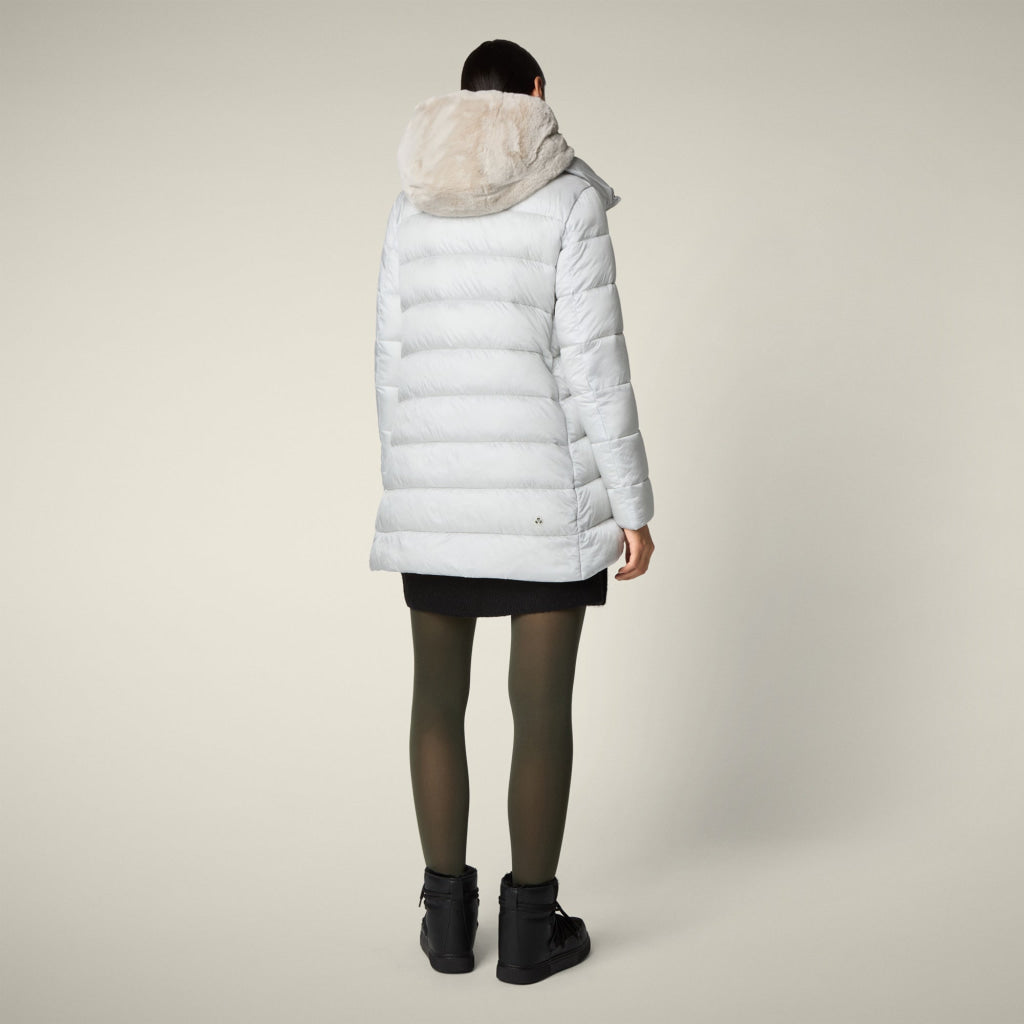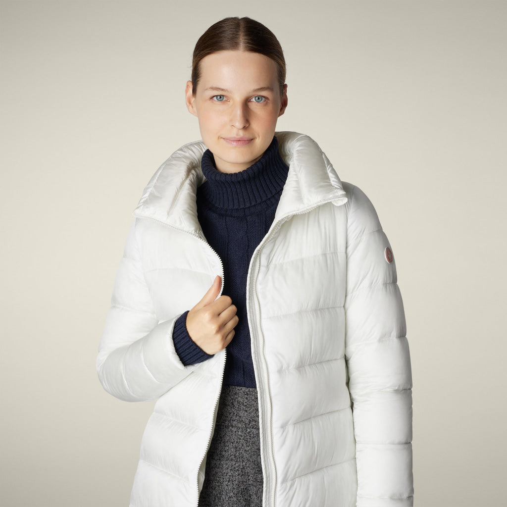 光沢のあるリサイクル・ナイロン製のAライン・ミドル丈パファー「MATILDA」は、同系色の取り外し可能なフェイクファーをフロントパネルとフードにあしらい、洗練されたタッチに。RECYCLED PLUMTECH®のパッド入りで保温性も抜群。シグネチャーの引手を備えた2WAYジッパー、隠しジッパー式ポケット、袖の同系色のロゴが特徴です。