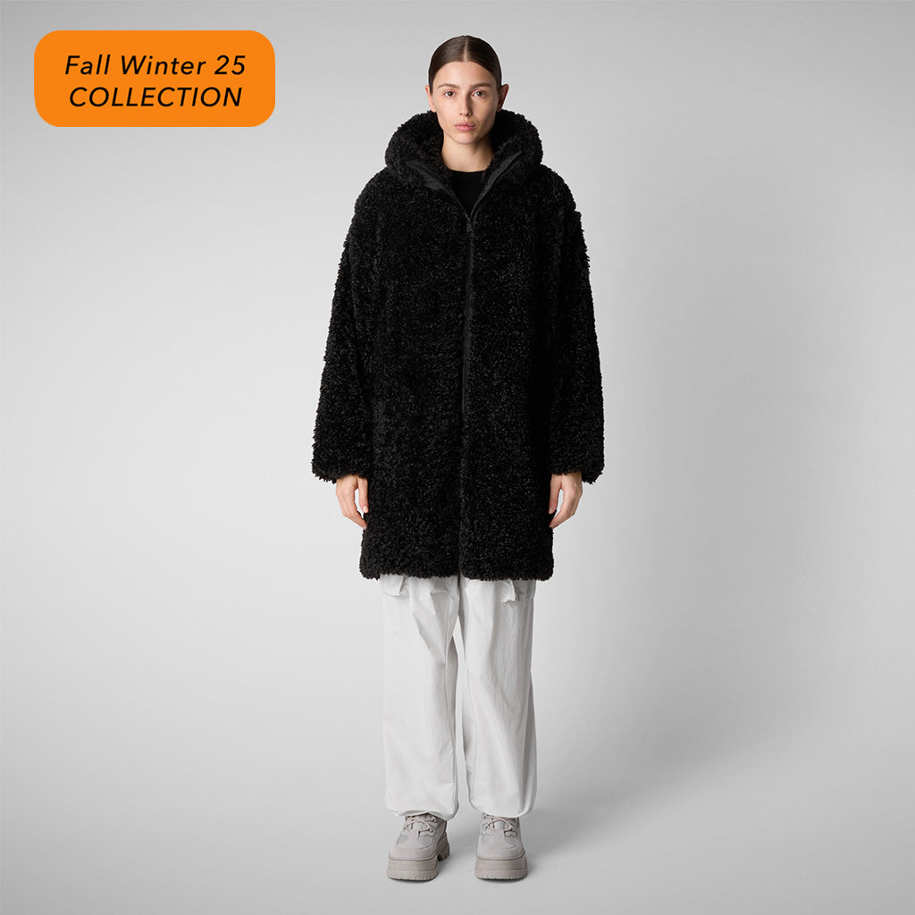 ゆったりとしたフィットのコート「ANGELICA」は、リサイクル・ポリエステルのフェイク・シャーリング製のファッショナブルなスタイル。フードとポケットはコントラストカラーの防水素材。フロントはシグネチャーの引き手が付いた2WAYジップ仕様。左袖には同系色のラバーロゴ入り。